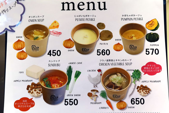 スープは、オニオンスープ、じゃがいものポタージュ、かぼちゃポタージュ、スンドゥブ、フラノ産野菜とチキンのスープ、そしてコーンスープからお選びいただけます。