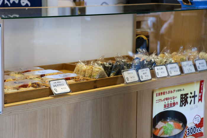 3種のミニおむすびとおかずがセットになったおむすびBOX(630円)、汁物は富良野産野菜を使った豚汁(300円)もご用意しております。