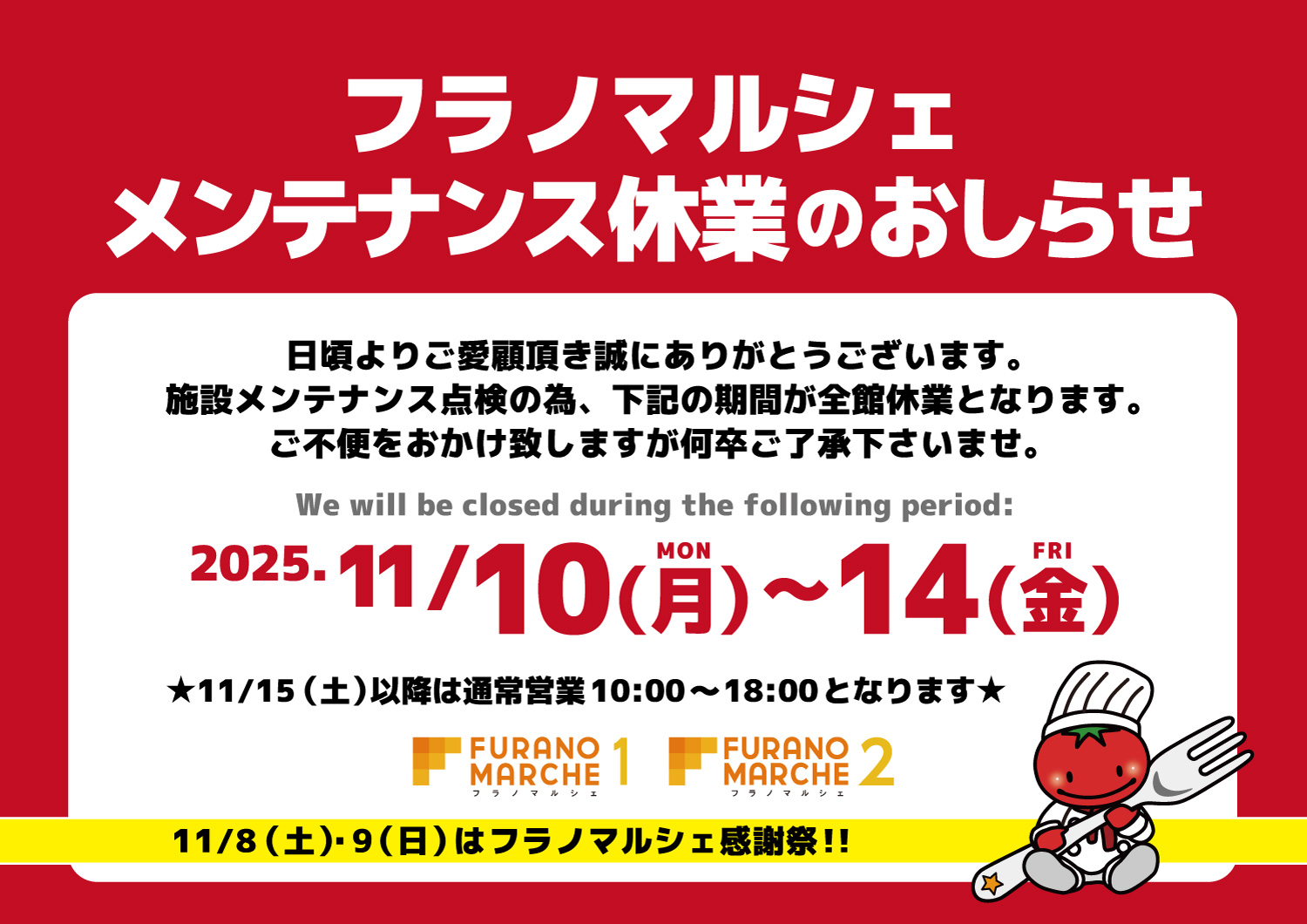 休業直前の11月8日(土)・9日(日)はフラノマルシェ感謝祭です。詳細は間もなく発表いたします!