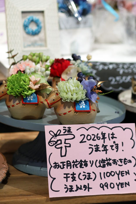来年の干支は午(ウマ)!手のひらサイズの造花の置物も毎年人気です。