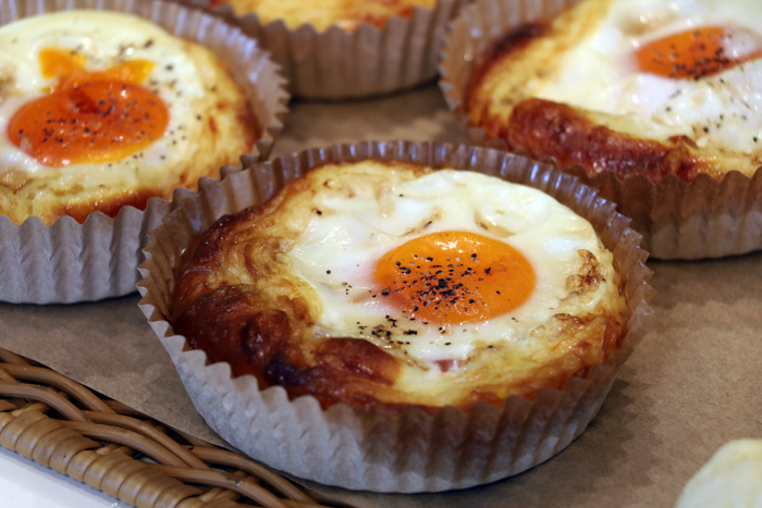 ベーコンエッグにマヨネーズ、たまねぎ、チーズを乗せて焼き、仕上げにお醤油をかけた見かけによらず和風の味のパン。