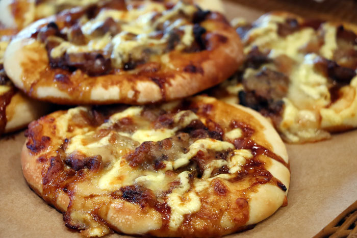 ジューシーな鶏ハラミを照り焼きソースで和え、玉ねぎ・マヨネーズ・チーズをのせて焼いた、味付けバッチリ、ボリュームもあるピザパンです。
