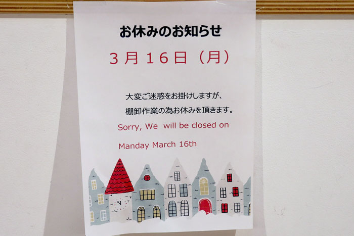 明日2026年3月16日(月)は棚卸作業のため、終日休業とさせていただきます。