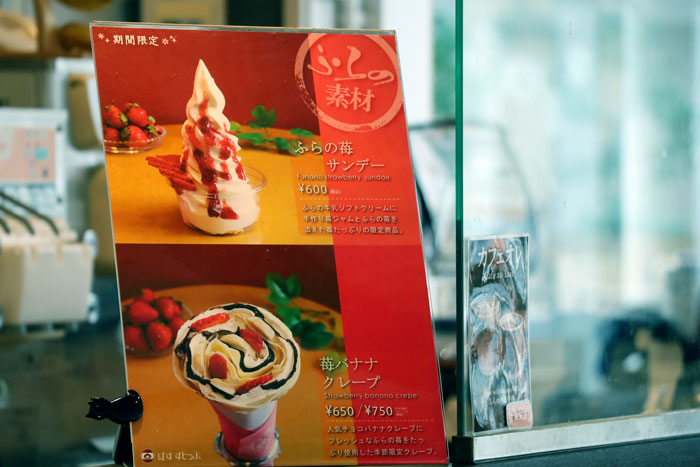 只今、春の人気メニューである苺バナナクレープ(650円/アイス付き750円)とふらの苺サンデー(600円)もおすすめ。