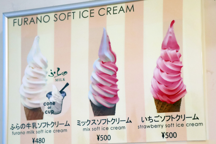 マルシェ2ばすすとっぷ2のふらの牛乳ソフトクリームに、季節限定のいちごフレーバーが、今年も登場しました。