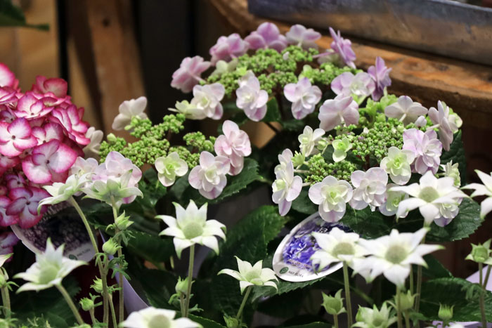 既に、毎年はなや日々色の母の日の贈り物としても人気の紫陽花の鉢植えが、色鮮やかに並びます。