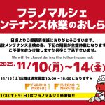 2025/11/02 / 最終更新日 : 2025/11/02 staff マルシェ 11/10-14 メンテナンス休業のお知らせ 日頃よりご愛顧いただき誠にありがとうございます。施設メンテナンス点検のため、下記の期間が全館休業となります。ご不便をおかけいたしますが何卒ご了承くださいませ。 休業期間: 2025年 11月10日(月)~14日(金) な […]